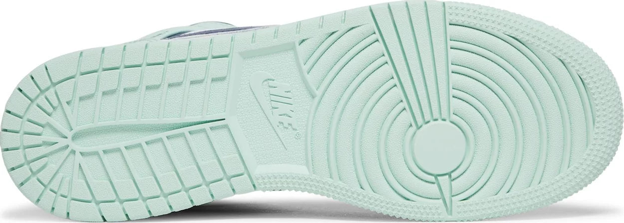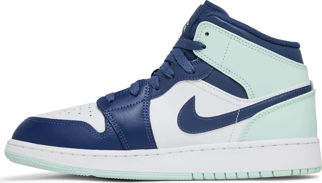 The Air Jordan 1 Mid Blue Mint (GS) features a striking blue and white color combination with bold Metallic Silver accents on the TPU midsole and heel counter. The Nike Air logo pops in Electrolime on the tongue, adding a vibrant touch. The midsole is designed with deep flex grooves for flexibility, while the durable white rubber outsole provides excellent traction and support. This sneaker blends classic design with eye-catching details for a fresh, dynamic look.